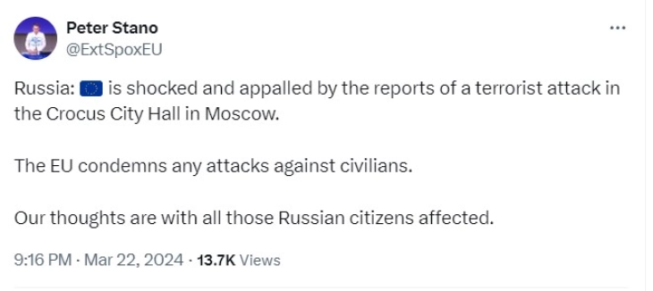 Европската Унија е шокирана и згрозена од извештаите за терористичкиот напад во Крокус Сити Хол во Москва, напиша на Х портпаролот за надворешни работи на Унијата Петер Стано на Х.