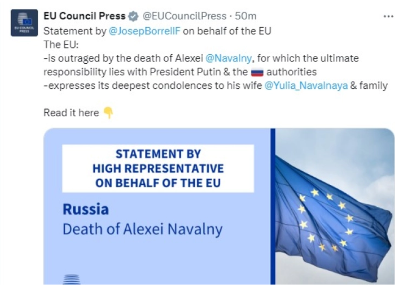 Во соопштението се вели дека „Европската унија е огорчена од смртта на рускиот опозициски политичар Алексеј Навални“ и се додава дека „Русија мора да дозволи независна и транспарентна меѓународна истрага за околностите на неговата ненадејна смрт“.