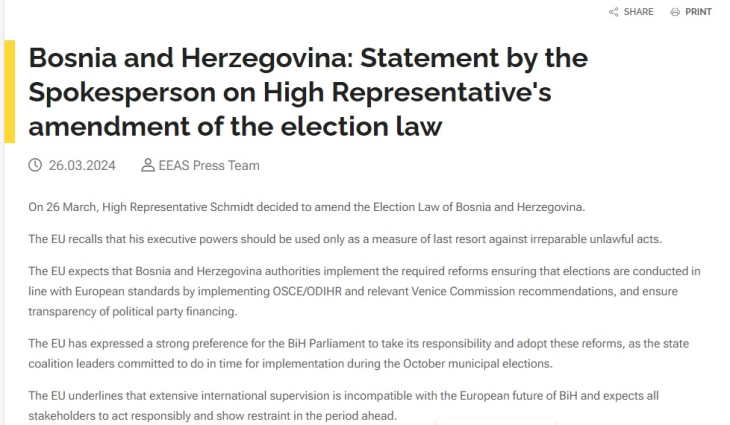 Високиот претставник во Босна и Херцеговина, Кристијан Шмит, треба да ги користи своите извршни овластувања само како последно средство против непоправливи незаконски дејствија, соопшти Европската служба за надворешни работи (ЕЕАС) во врска со одлуката на Шмит да наметне измени во Изборниот закон nа БиХ.