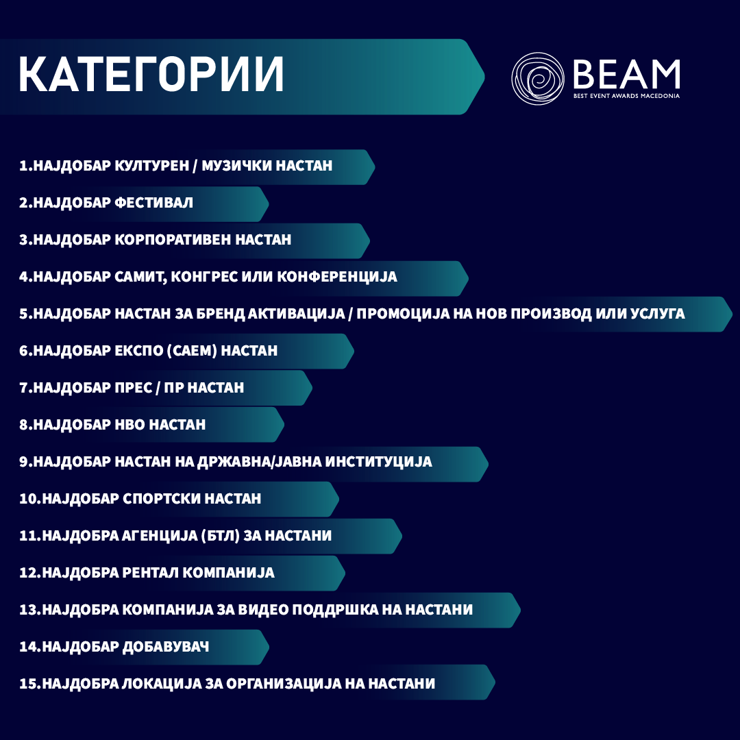 Оваа година по втор пат ќе се одржи БЕАМ Фестивалот кој ги наградува најдобрите и најуспешни настани одржани во 2023 година и веќе е отворена можноста за пријавување. БЕАМ Фестивалот (Best of event awards Macedonia) е на иницијатива и во организација на Асоцијацијата на ивент индустријата ИВАП а произлезе како потреба за мапирање на индустријата и валоризирање на работата на професионалците.