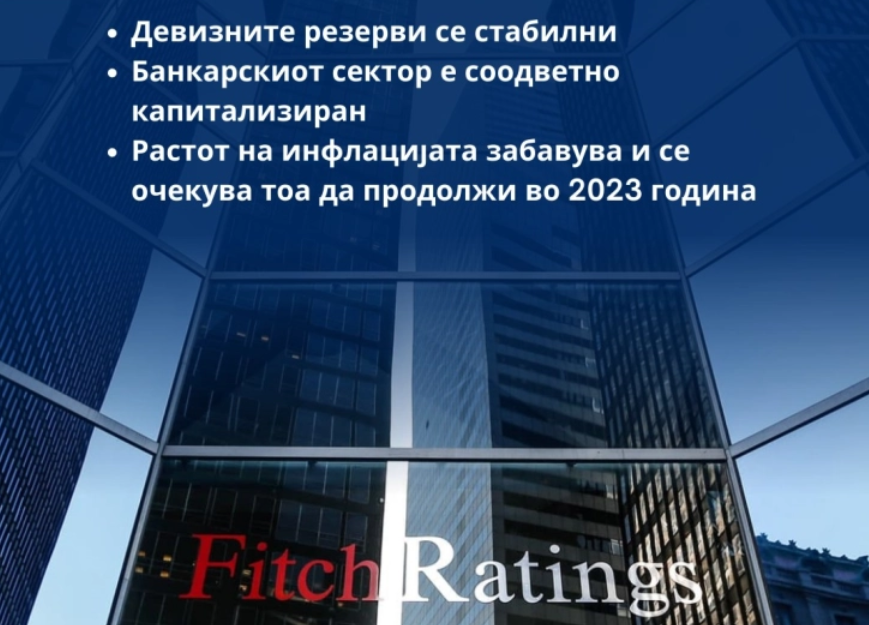Македонската економија покажа отпорност на глобалните шокови. Макроекономската стабилност е задржана, поддржана од конзистентната поставеност на политиките и долгорочната стабилност на девизниот курс. И покрај притисоците од увозните цени на енергентите врз трговскиот дефицит, во 2022 година девизните резерви забележаа раст од 270 милиони евра, се дел од заклучоците за монетарниот дел во извештајот на агенцијата за кредитен рејтинг „Фич“, во кој се подобрува изгледот на кредитниот рејтинг на земјава, на ББ+ со стабилен изглед.