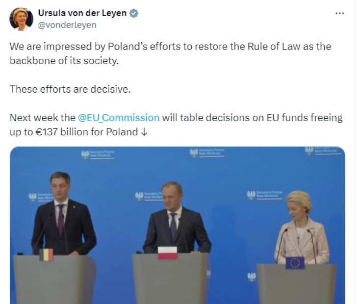 Фон дер Лајен соопшти дека следната недела ќе има две одлуки за фондовите на Европската Унија за Полска со кои ќе се одмрзне вкупен износ до 137 милијарди евра.
