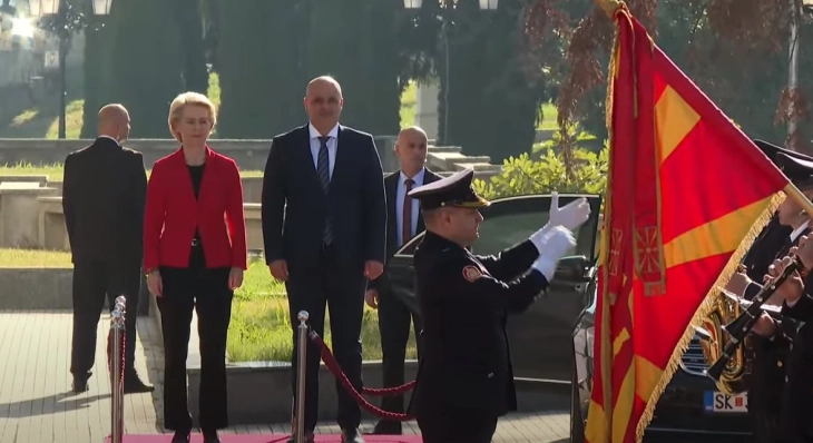 Премиерот Димитар Ковачевски со највисоки државни почести ја пречека претседателката на Европската комисија Урсула фон дер Лајен, која е во официјалната посета на државава.