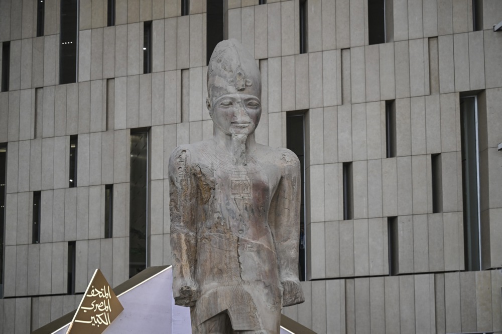 epa12497156 A statue of King Ramses II displayed at the Grand Egyptian Museum ahead of the opening ceremony in Giza, Egypt, 01 November 2025. The Grand Egyptian Museum, the world’s largest museum dedicated to a single civilization, is set to open officially on 01 November 2025 with an inauguration ceremony expected to be attended by numerous heads of state. EPA/MOHAMED HOSSAM