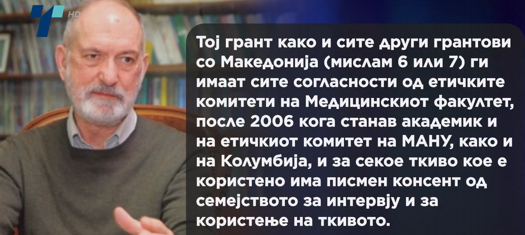 „Тој грант како и сите други грантови со Македонија (мислам 6 или 7) ги имаат сите согласности од етичките комитети на Медицинскиот факултет, после 2006 година кога станав академик и на етичкиот комитет на МАНУ, како и на Колумбија и за секое ткиво кое е користено има писмен консент од семејството за интервју и за користење на ткивото.“