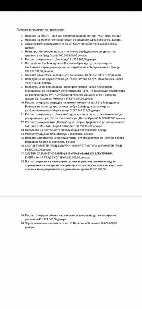 Во неколку наврати Арсовска ги посочи и проектите кои ги кочеа советницигте на ВМРО-ДПМНЕ кои го имаа мнозинството во Град Скопје. Во продолжение го објавуваме списокот на проекти блокирани од владејачката партија, чиј кандидат е Орце Ѓорѓиевски.