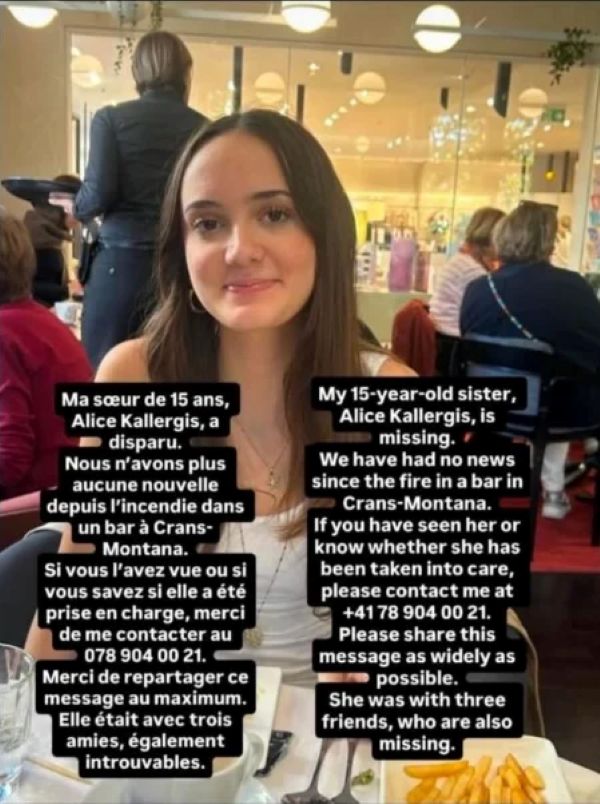 Грчка државјанка се смета за исчезнат после пожарот што избувна во преполн бар за време на новогодишната забава во луксузниот швајцарски скијачки центар Кран-Монтана, при што загинаа околу 40 лица, а околу 115 беа повредени, соопштија властите, во Грција.