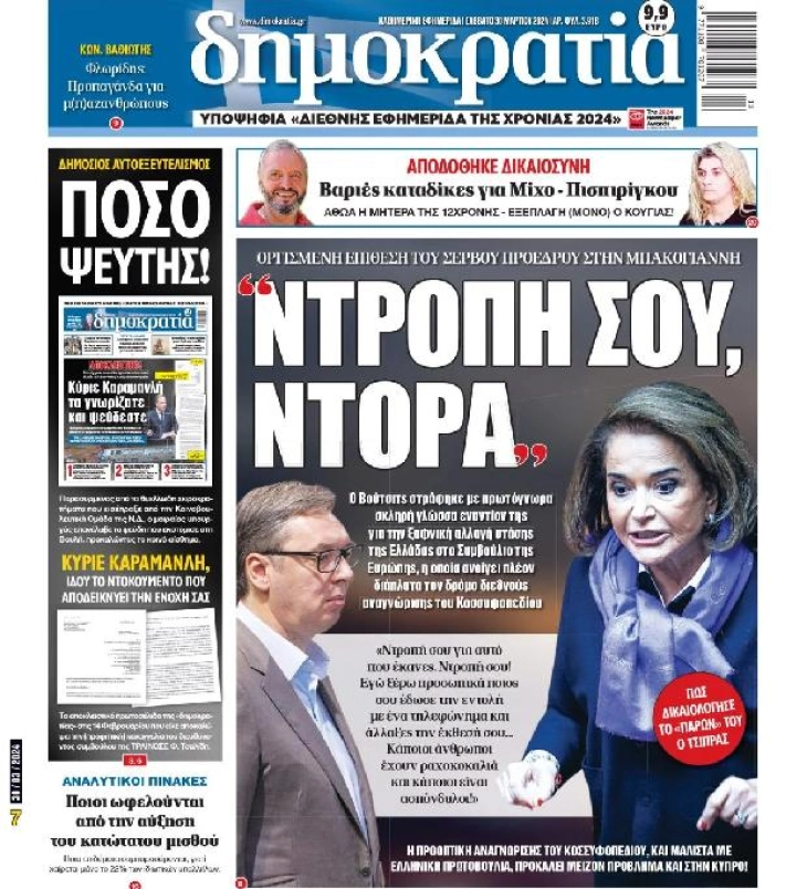 На насловната страница на грчкиот весник „Демократија“ објавено е дека претседателот на Србија, Александар Вучиќ, во синоќешното обраќање до јавноста, изразил остра осуда за позитивното мислење на известувачката Дора Бакојани за прием на Косово во Советот на Европа, оценувајќи го како промена на ставот на Грција.