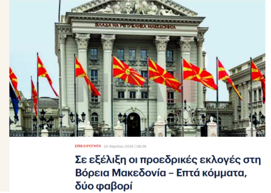 „Претседателски избори во Северна Македонија“; „Северна Македонија: Клучни избори за претседател на земјата“; „Во тек се претседателски избори во Северна Македонија: седум партии, двајца фаворити“; „Избори во Северна Македонија: седумтемина кандидати, аутсајдерите и вториот круг“ „Денеска прв круг од претседателските избори во Северна Македонија“, се дел од насловите во онлајн изданијата на грчките медиуми за првиот круг од претседателските избори, јави дописничката на МИА од Атина.