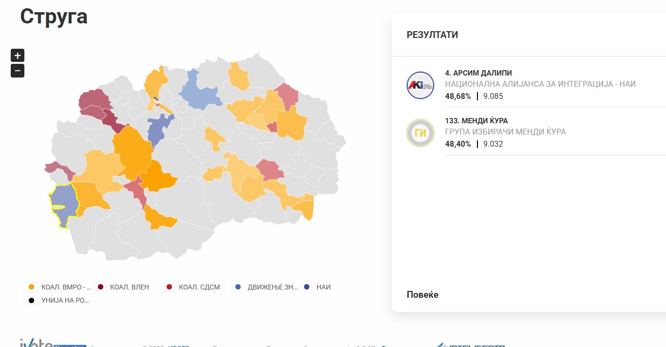 По затворањето на избирачките места, првичните броења од дел од избирачки места покажуваат минимална разлика меѓу кандидатите Арсим Далипи и Менди Ќура — буквално дел од процент. Трендот е променлив и зависи од пристигнувањето на преостанатите записници, особено од урбаните пунктови и селските избирачки места со поголема тежина во конечниот збир.