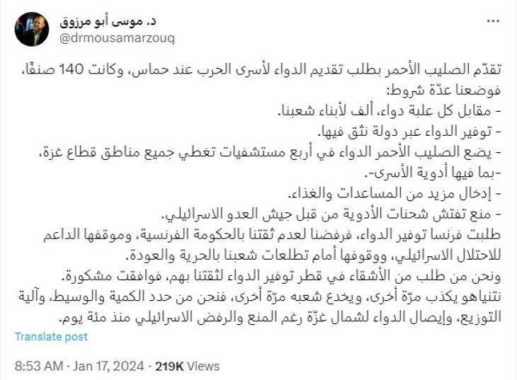 Високиот функционер на Хамас Муса Абу Марзук најави дека за секоја купена кутија со лекови за заложниците ќе бидат испратени 1.000 кутии за палестинските цивили.