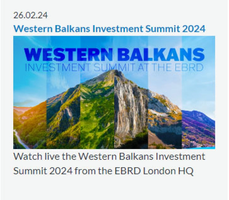 Европската банка за обнова и развој (ЕБОР) објави дека Инвестицискиот самит за Западен Балкан 2024 година ќе се одржи в понеделник, на 26 февруари, во седиштето во Лондон.