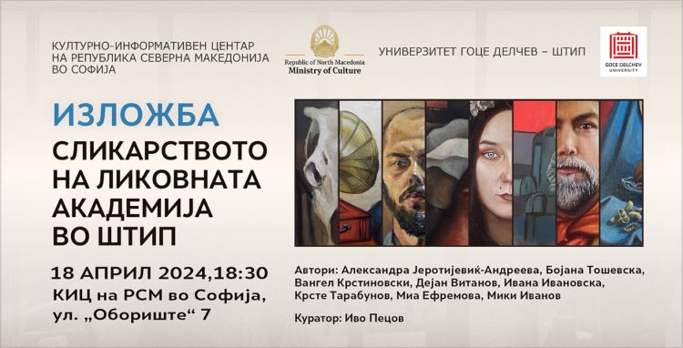 Во галеријата на Културно-информативниот центар на Република Северна Македонија во Софија на 18 април (четврток) 2024, со почеток од 18:30 часот, ќе биде отворена ликовната изложба „Сликарството на Ликовната академија во Штип“.