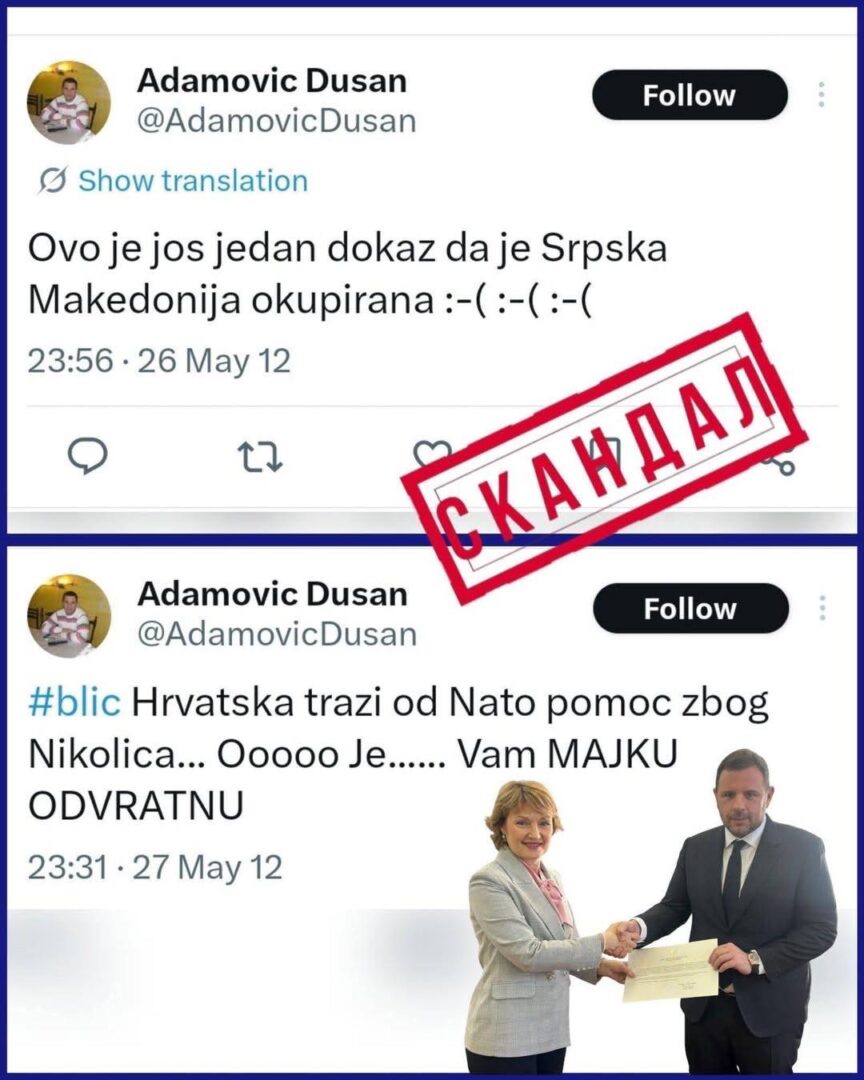 СДСМ, исто така, тврди дека на социјалната мрежа X можат да се најдат постари објави припишани на Адамовиќ, во кои, како што наведуваат, се користи формулацијата „српска Македонија“ и се зборува за „окупираност“ – квалификации што партијата ги оценува како навредливи и политички проблематични во контекст на македонските национални и државни позиции.