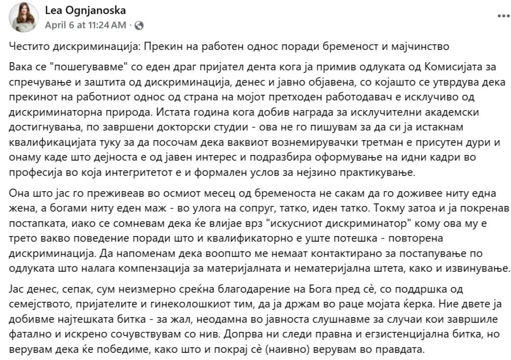 Постапката е поведена по претставка поднесена во ноември лани. Според наводите во пријавата, асистентката работела од октомври 2022 до октомври 2025 година, уредно ги извршувала обврските, а во меѓувреме докторирала и ги исполнила условите за избор во повисоко звање. Клучниот пресврт, според нејзиниот исказ, настанал откако во април 2025 година соопштила дека е бремена, а во септември била известена дека договорот нема да ѝ биде продолжен. „Она што јас го преживеав во осмиот месец од бременоста не сакам да го доживее ниту една жена“, вели таа во изјава објавена денес.