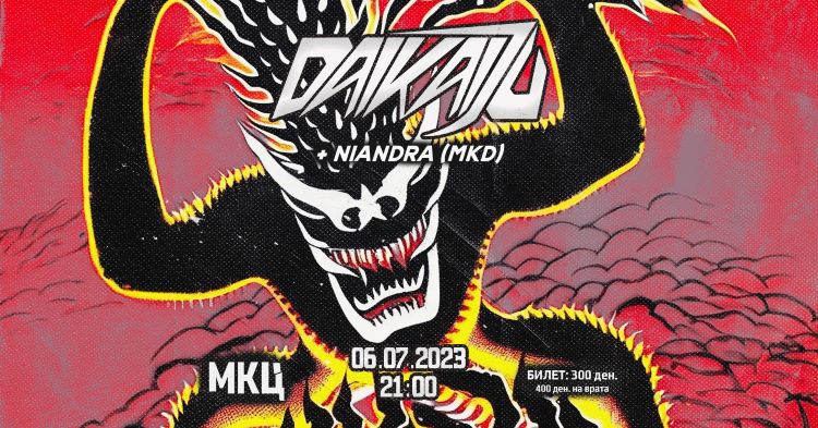 На 6 јули (четврток) со почеток од 21 ч. во МКЦ гостува бендот Daikaiju. Тие се мистериозна појава на звук и слики за прв пат забележани зимата 1999 година. Како бурни претставници на звучниот хаос, Daikaiju се инспирираат од звукот на брановите кои удираат и создаваат музика на начин што влева шок и стравопочит кај сите кои ги искусуваат нивните настапи во живо.