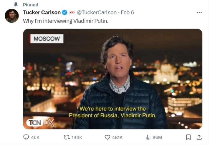 Карлсон синоќа ги објави своите планови за интервју со рускиот претседател. Видео најавата до вечерва ја погледнаа повеќе од 85 милиони корисници на платформата X.