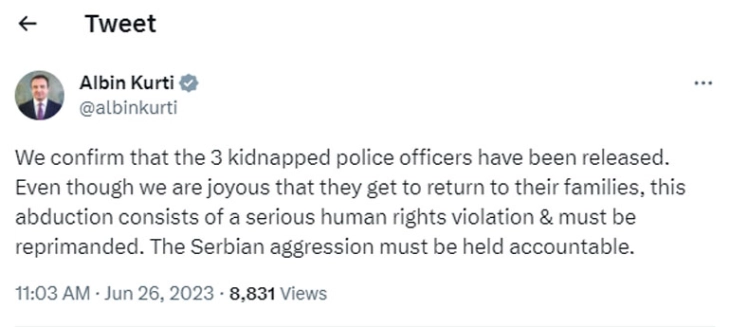 – Потврдуваме дека тројцата киднапирани полицајци се ослободени. Иако сме среќни што се вратија кај семејствата, ова киднапирање е сериозно кршење на човековите права и мора да биде опоменати. Агресијата на српската страна мора да се смета за одговорна, напиша Курти на Твитер.