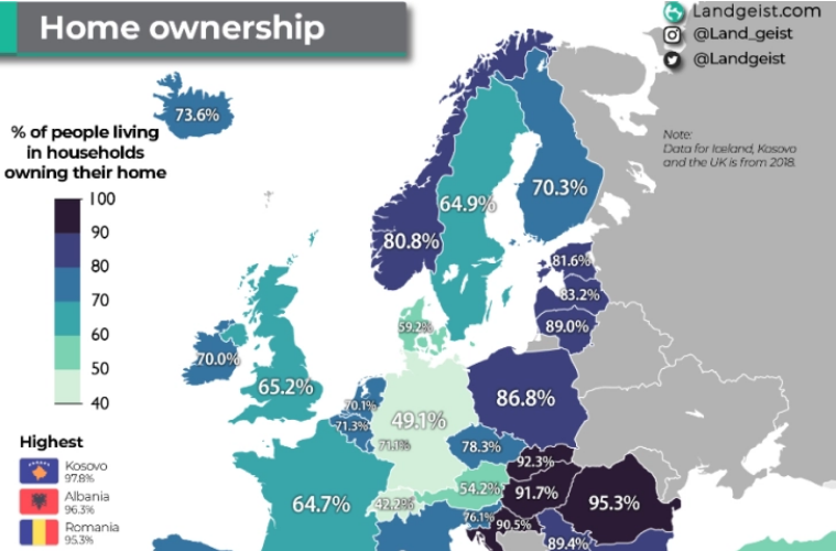 Германија (49,1%) и Швајцарија (42,2%) имаат далеку најниска стапка на сопственост на домови во Европа. Тие се единствените земји каде што сопствениците на куќи се помалубројни од оние кои живеат во изнајмени домови.
