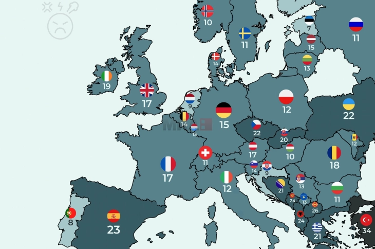 На листата, првото место го зазеде Турција, каде што 34 отсто од жителите секојдневно изразуваат одредена доза гнев. Македонците се втори, со 26 отсто од испитаниците кои изјавиле дека се чувствуваат лути во текот на денот. По нив следуваат Албанците и Црногорците (24 насто), а потоа и Шпанците (23 насто).