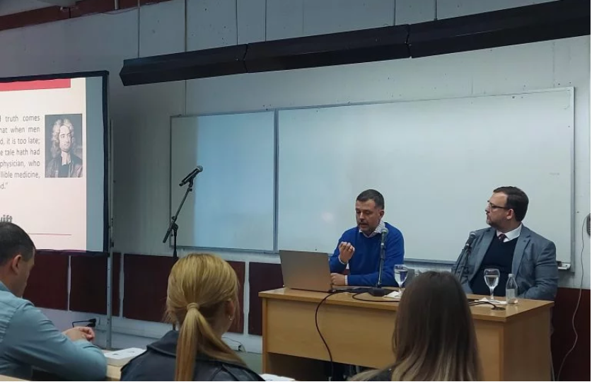 Д-р Неријус Малиукевичиус е водечки литвански експерт за медиуми и кризна и стратешка комуникација, со геополитички фокус на улогата на Русија и Белорусија по овие прашања. Тој денеска им зборуваше на присутните дека преку дезинформациите и пропагандата се слабеат политичките противници. Кажа дека е важно да се запрашаме, што е пораката и зошто има обид таа да се испрати.