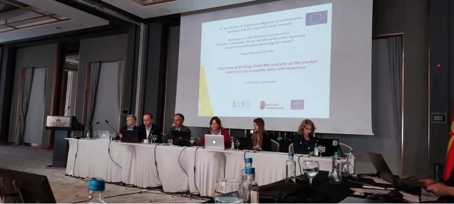 Кевин го претстави Прегледот на наодите од анализата на пазарот и на економските податоци и ресурси, додека Трпевска говореше на темата „Структурни прашања за пазарот – правила за сопственоста на медиумите, механизми за доделување дозволи и закани за плурализмот идентификувани во Мониторот на медиумскиот плурализам на ЕУ“. Експертот за авторско и сродни права Валентин Пепељугоски говореше за Пристапите кон прашањата за пиратеријата и авторските права.