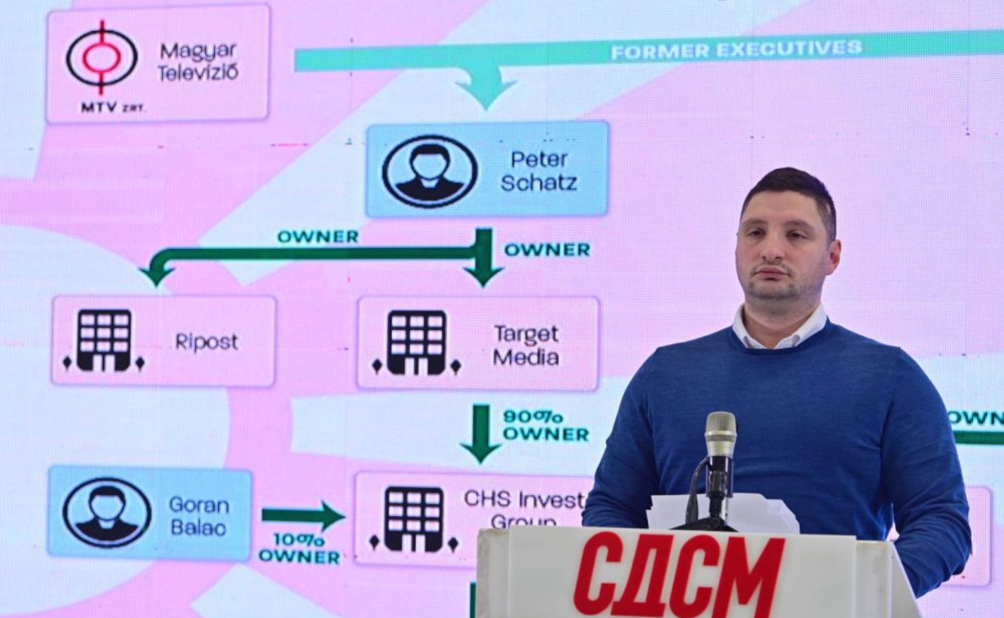 Во обраќањето беше изнесена теза дека се работи за „политички проект“ за ширење на влијанието на Орбан, со цел преземање контрола врз стратешки сектори, при што како клучни актери беа посочени унгарски компании и поранешни високи функционери од унгарскиот јавен сервис – Агнес Адамик и Петер Шац – за кои СДСМ тврди дека се блиски до Орбан и дека „систематски купувале контролни удели“ во македонски телевизии и портали.