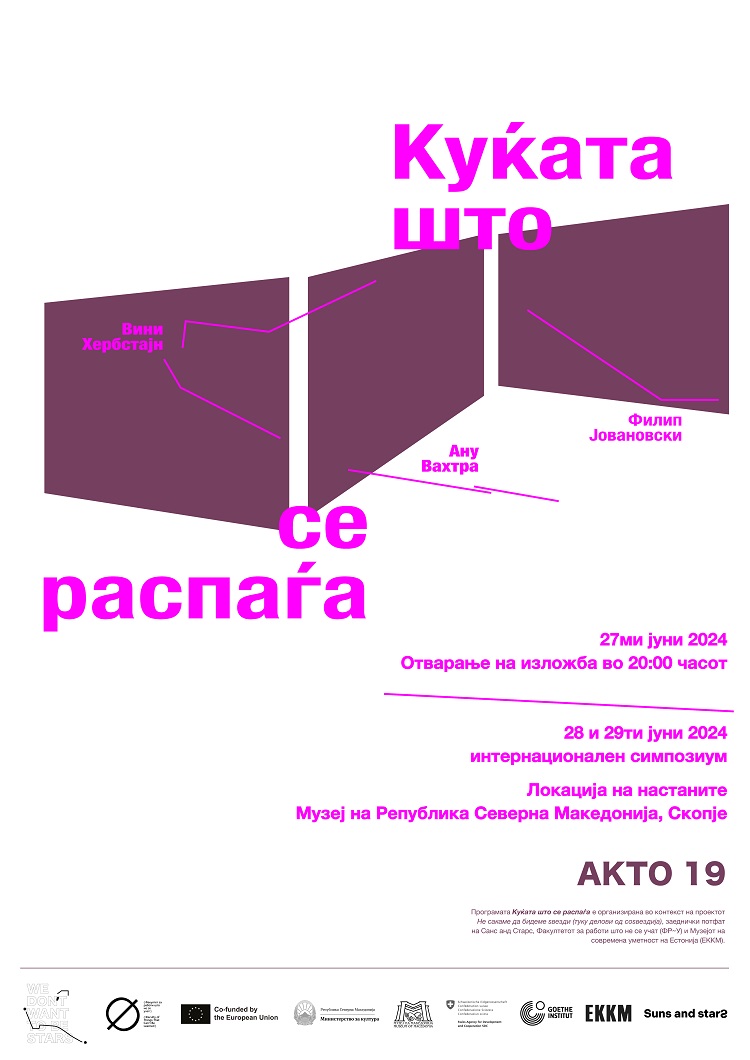 Во продукција на Факултетот за работи што не се учат – ФРУ во рамките на проектот Не сакаме да бидеме ѕвезди (туку дел од соѕвездијата) поддржан од Европската Унија, од 27 до 29 јуни во Музејот на Република Северна Македонија ќе се одржи меѓународната изложба и симпозиум Куќата што се распаѓа.