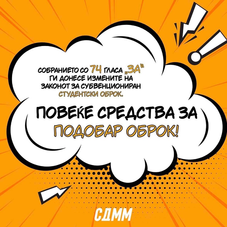 Претседателот на Социјалдемократската младина, Марко Михаилоски ги поздрави измените на Законот за субвенциониран студентски оброк со кои се зголемуваат средствата за таа намена.