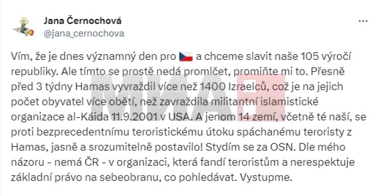 – Само 14 земји, вклучително и нашата, јасно и разбирливо се изјаснија против невидениот терористички напад на терористите од Хамас. Се срамам од ОН. Според мене, Чешка нема што да бара во организација која навива за терористи и не го почитува основното право на самоодбрана. Да излеземе, напиша Чернохова синоќа на Х.
