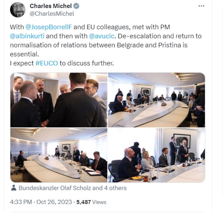– Со високиот претставник на ЕУ за надворешна политика, Жозеп Борел и колегите од ЕУ, имав средба со премиерот на Косово, Албин Курти, а потоа и со претседателот на Србија, Александар Вучиќ. Деескалација и нормализација на односите помеѓу Белград и Приштина е од суштинско значење, напиша Мишел на платформата Икс.