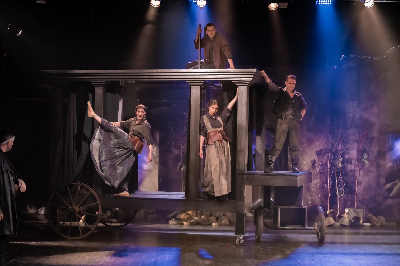Мајка Храброст доаѓа – продава чизми, гас-маски, борбен дух натопен во крвава пареа, солзи и религиозно лудило. Таа е хиената на бојното поле, некрунисаната кралица на воениот капитализам. Оваа претстава е искрена, трогателна семејна сага за тоа како војната ги голта своите деца – но и за тоа како работата мора да продолжи, без разлика на сè.