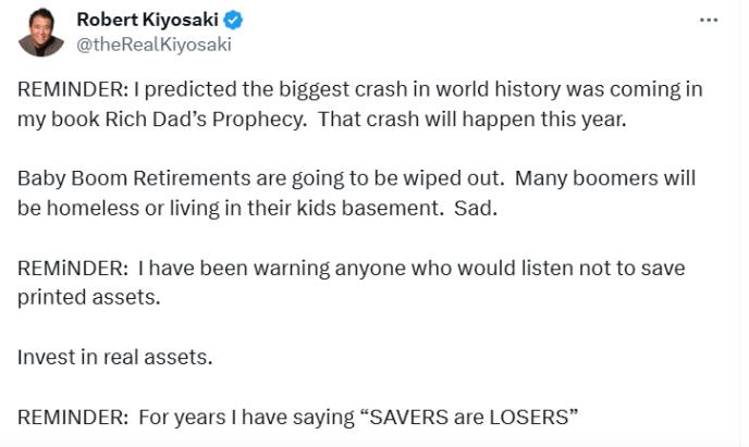 „Пензиите на генерацијата „бејби бум“ ќе бидат збришани, многумина ќе станат бездомници или ќе живеат во подрумите на своите деца. Тажно“, – напиша Кијосаки во порака што предизвика големо внимание кај неговите следбеници.