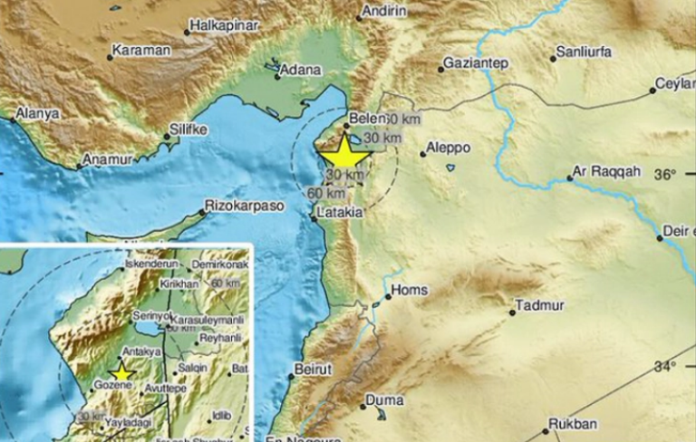 Епицентарот на земјотресот бил на 60 километри северно од сирискиот град Латакија и 30 километри јужно од турскиот град Белен.