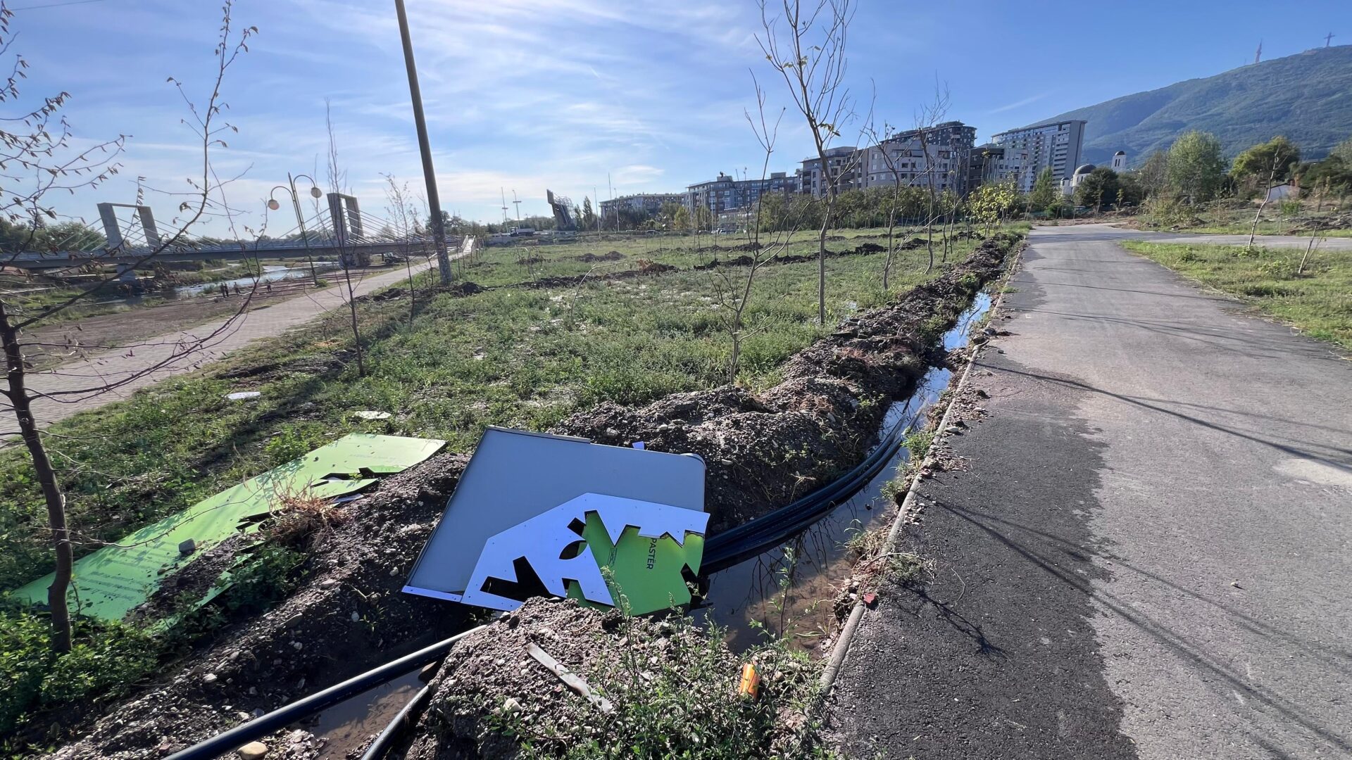 Иако изградбата започна пред само две недели, новиот парк на кејот кај Карпош 4 веќе покажува знаци на распаѓање. Рекламните табли се пропаднати во земја, просторот е обраснат со трева и грмушки, а наместо уредена зелена зона, граѓаните гледаат слика на запуштеност и небрежност.