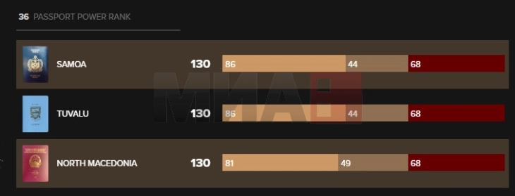 Пасошот на Северна Македонија е на 36 место, заедно со Самоа и Тувалу, чии граѓани без виза можат да патуваат во 130 земји.