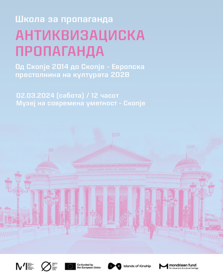 На 2 март (сабота) со почеток во 12:00 часот во Музејот на современа уметност (МСУ) – Скопје, ќе се одржи Школата за пропаганда – АНТИКВИЗАЦИСКА ПРОПАГАНДА. Од Скопје 2014 до Скопје – Eвропска престолнина на културата 2028.