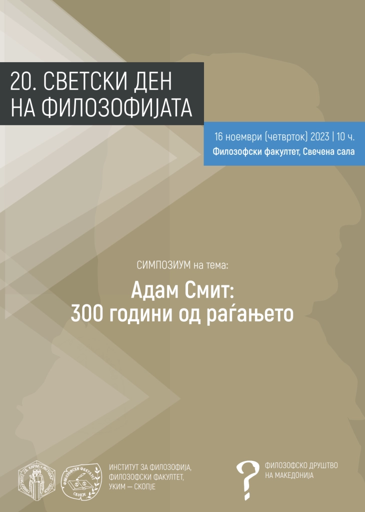 Светскиот ден на филозофијата кај нас ќе биде одбележан со симпозиум насловен „Адам Смит: 300 години од раѓањето“ на кој е најавено учество на осум истакнати филозофи, професори и истражувачи – Љубомир Гајдов, Радомир Виденовиќ (Србија), Денко Скаловски, Стивен Фридман (САД), Јасмина Поповска, Бошко Караџов, Куштрим Ахмети и Игор Поп Трајков.