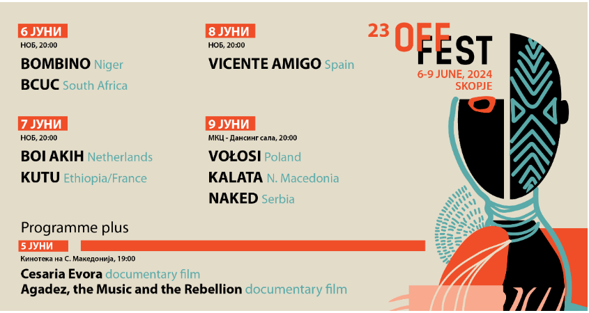 Дваесет и третото издание на традиционалниот ОФФ-Фест ќе се одржи од 6 до 9 јуни во Националната опера и балет, Младинскиот културен центар и Кинотека на С. Македонија, со осум концертни настапи и два документарни филма. Програмата е свежа, географски разнобојна и возбудлива, можеби најсилна во скорешната историја на фестивалот, најавуваат од фестивалот.
