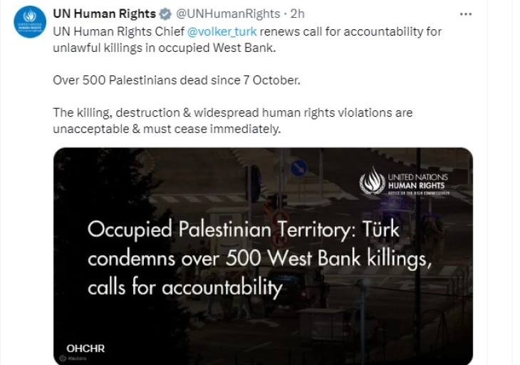 Високиот комесар на ОН за човекови права, Волкер Тирк, денеска го осуди насилството на Западниот Брег и повика тоа да прекине, велејќи дека е несфатливо повеќе од 500 Палестинци да се убиени на таа територија од 7 октомври минатата година.