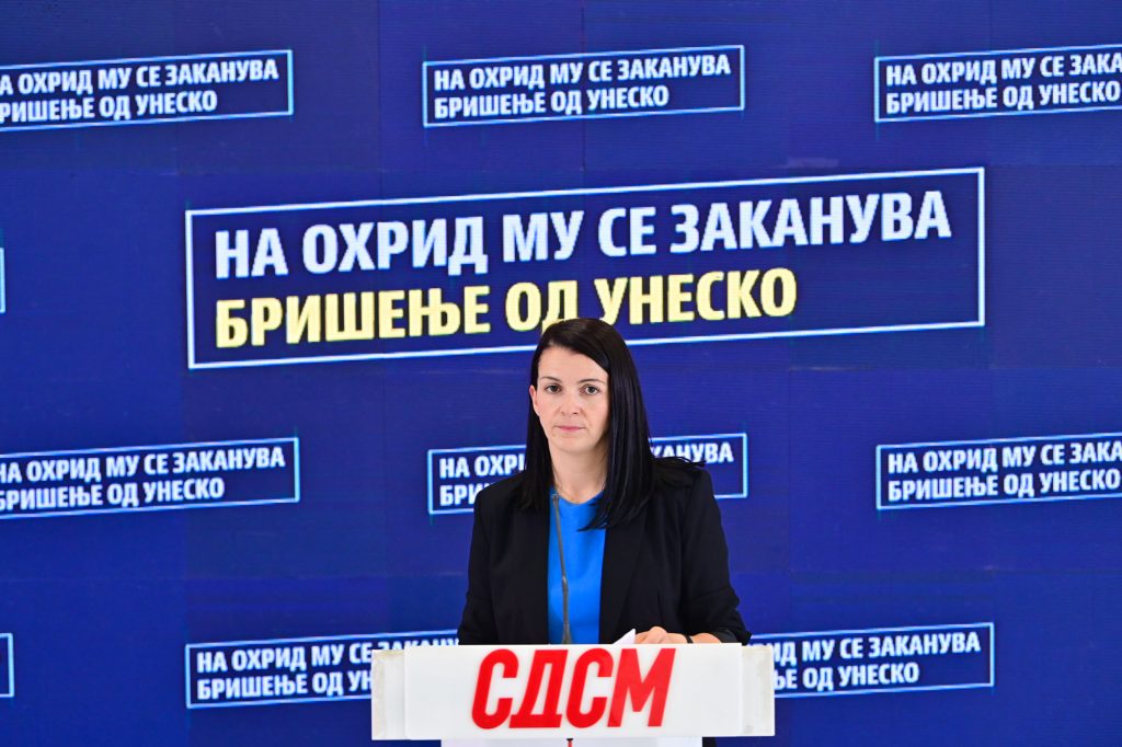 Охридскиот регион може да ја изгуби престижната ознака на УНЕСКО – предупреди денеска пратеничката Бисера Костадиновска-Стојчевска (СДСМ). На прес-конференција во Собранието таа обвини дека Владата на ВМРО-ДПМНЕ „ги повлекла или стопирала најмалку десет клучни закони и проекти“ за заштита на езерото и старото градско јадро, оставајќи го доброто без системска заштита.