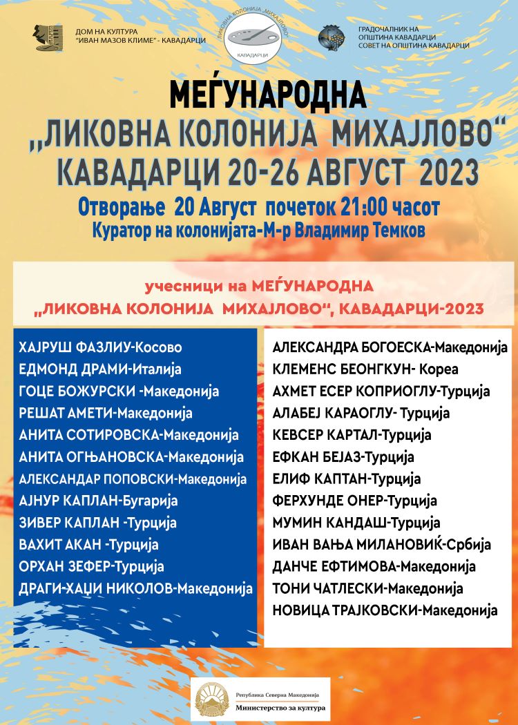 Во недела на 20 август, со почеток од 21 часот, во Летната бавча на Дом на култура “Иван Мазов – Климе“ Кавадарци, ќе биде отворена традиционалната Меѓународната ликовна колонија “Михајлово – Кавадарци 2023“. На годинашното издание на колонијата ќе учествуваат 25 ликовни уметници од Македонија, Косово, Италија, Бугарија, Турција, Кореа и Србија.