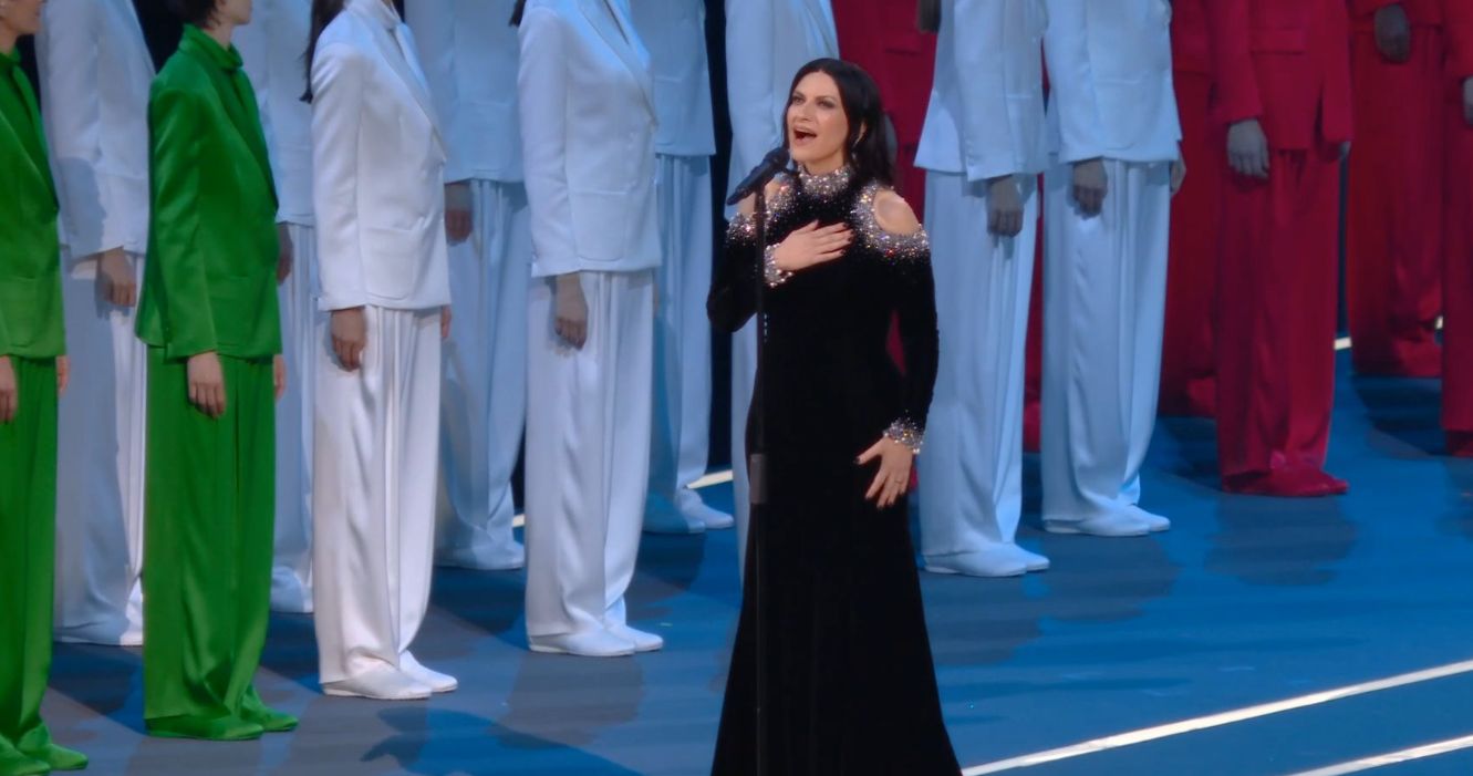 Една од најемотивните точки беше италијанската химна. „Fratelli d’Italia“ („Il Canto degli Italiani“) ја испеа Лаура Паузини, додека истовремено на сцената во Кортина беше прикажан историски момент: првпат почесната гарда што ја воведе химната и го презентираше знамето на домаќинот беше целосно составена од жени, а италијанското знаме беше подигнато синхронизирано и во Милано и во Кортина.