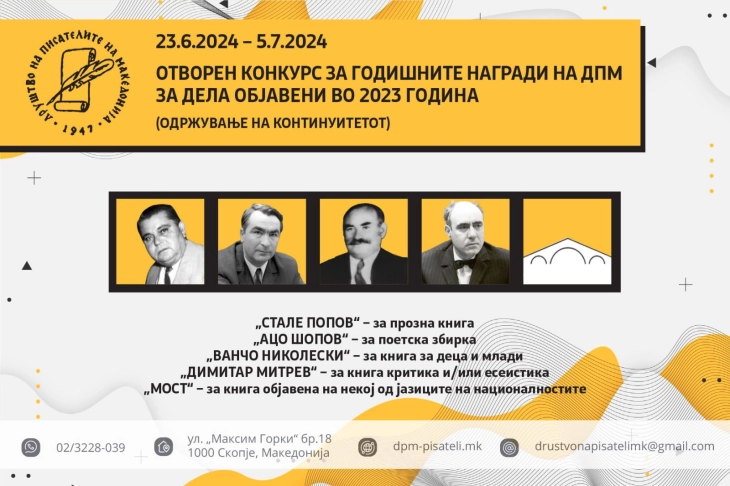 Управниот одбор на Друштвото на писатели на Македонија (ДПМ) го отвори традиционалниот конкурс за наградите „Стале Попов“ за прозно дело, „Ацо Шопов“ за збирка поезија, „Ванчо Николески“ за книга за деца и млади, „Димитар Митрев“ за книга критика и есеистика и „Мост“ за книга напишана на еден од јазиците на националностите.