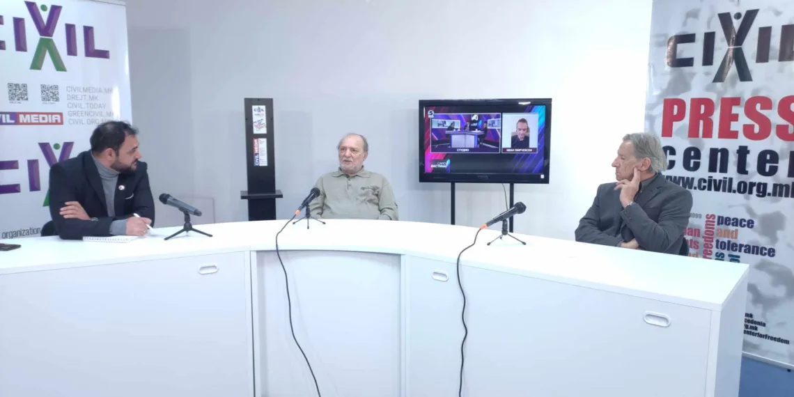 Аналитичарот Љубомир Костовски и новинарот Зоран Иванов во отвореното студио на ЦИВИЛ, во кое денеска ќе гостуваат новинари/уредници со долгогодишно искуство.