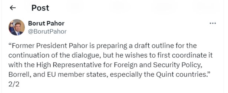 „Поранешниот претседател Пахор подготвува нацрт и рамка за продолжување на дијалогот, но тој сака прво да го усогласи со високиот претставник за надворешна и безбедносна политика Жозеп Борел и земјите-членки на ЕУ, особено со земјите од Квинта“, објави на профилот на X.