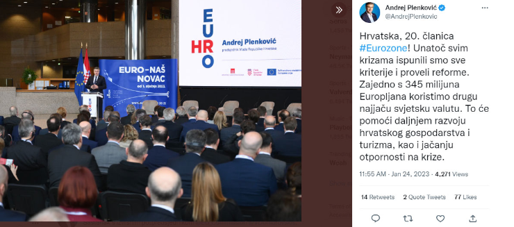 Во организација на Хрватската влада и Хрватската народна банка (ХНБ), во Националната и универзитетска библиотека (НСК) се одржа конференцијата „Хрватска – 20-та членка на еврозоната“, која беше отворена со воведни говори на хрватскиот премиер Андреј Пленковиќ и Комесарот за трговија при Европската комисија, Валдис Домбровскис, пренесува МИА.