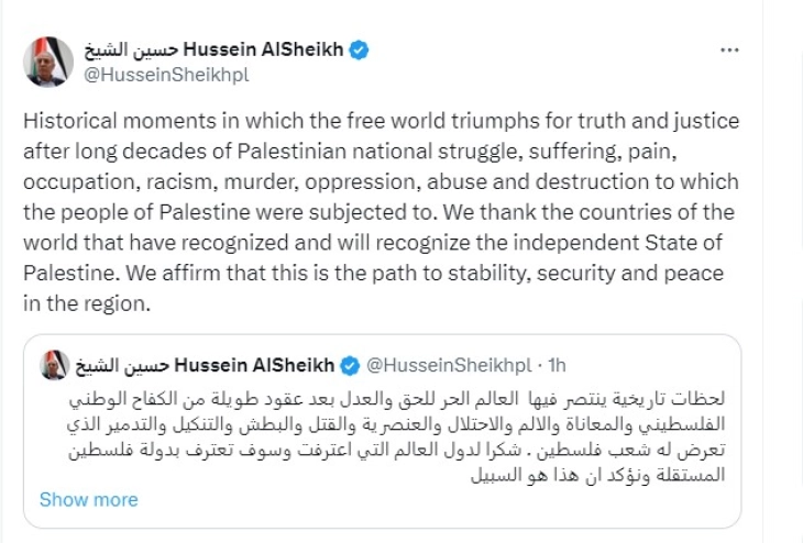– Историски моменти во кои слободниот свет триумфира за вистината и правдата по долги децении палестинска национална борба, страдање, болка, окупација, расизам, убиства, угнетување, злоупотреба и уништување на кои беше подложен народот на Палестина. Им благодариме на земјите во светот кои ја признаа и ќе ја признаат независната држава Палестина. Потврдуваме дека тоа е патот кон стабилноста, безбедноста и мирот во регионот, напиша Ал-Шеик на Х.