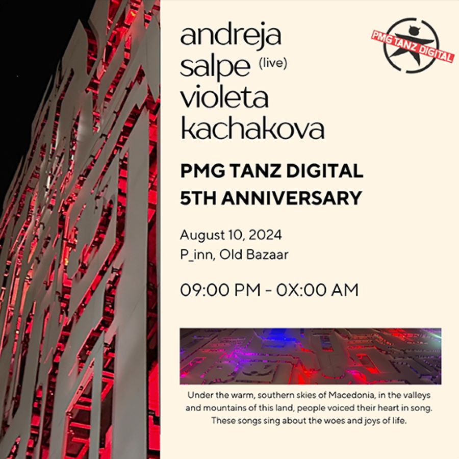 На 10 август (сабота), во градината на кафулето „P_inn“ во Старата скопска чаршија, со почеток во 21 часот ќе се реализира промотивен музички настан по повод 5 години активно делување на лејблот за електронска музика ПМГ Танц Дигитал (PMG Tanz Digital).