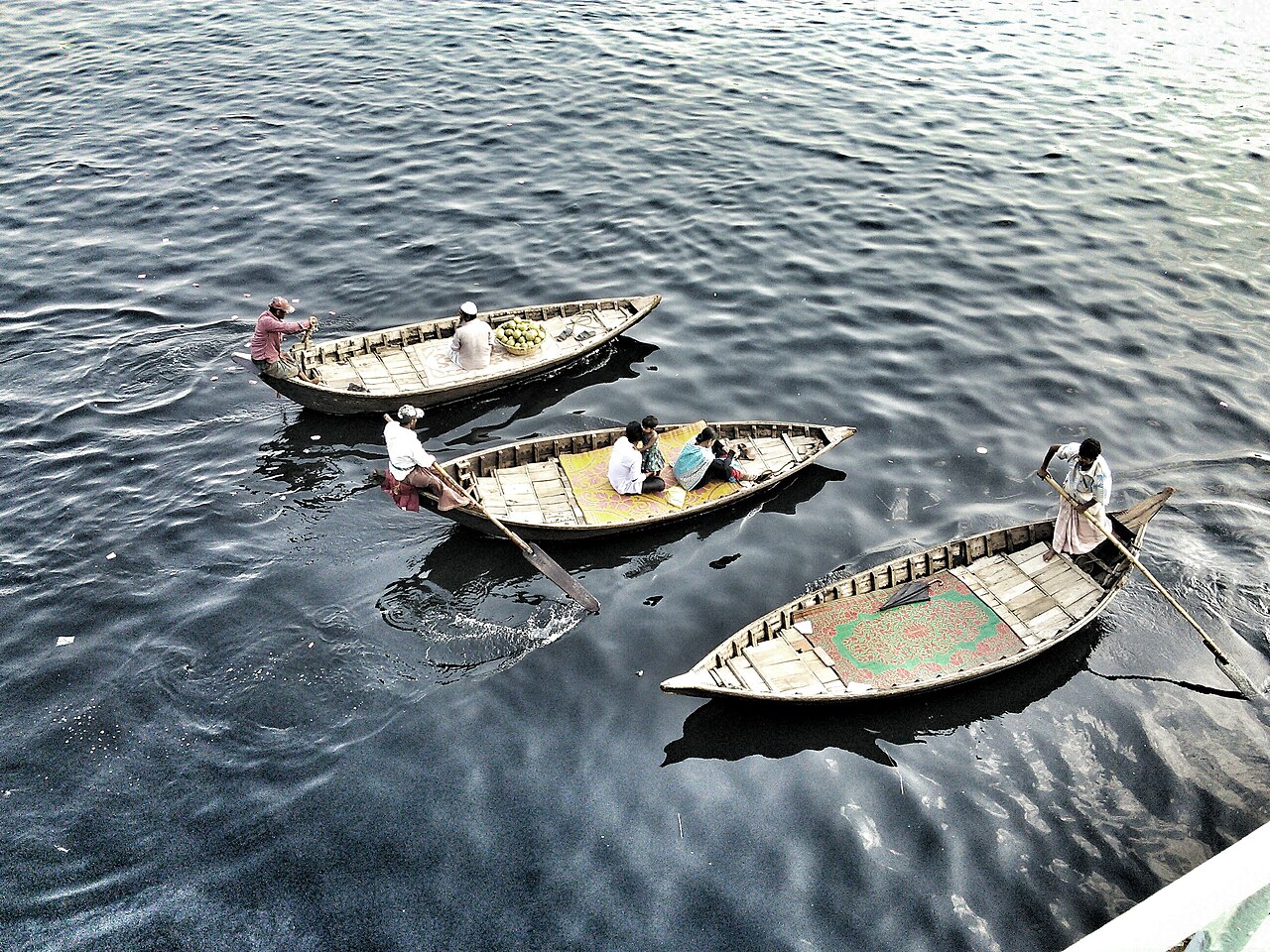 Токму тоа ја прави сликата толку вознемирувачка: животот не застанал, иако водата често е покриена со ѓубре, а нејзината површина во сувите месеци станува темна и тешка за дишење. Фотографиите што ги пренесуваат медиумите покажуваат луѓе на чамци, покрај брегови затрупани со отпад, во град во кој реката сè уште е дел од транспортот и секојдневната економија, иако нејзината еколошка состојба одамна е драматично нарушена.